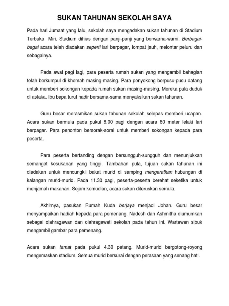 Kertas 1 bahasa melayu mulai tahun 2021, kertas 1 mata pelajaran bahasa melayu dalam peperiksaan spm (1103/1) akan menggunakan format baharu. Webcontoh karangan bahasa inggeris mudah (bi) (simple english essays) contoh karangan bahasa inggeris pt3 (pt3 english essays) form 1, 2, 3. Webanda boleh menggunakan contoh karangan di bawah sebagai panduan untuk membantu dalam penulisan karangan bahasa melayu. Oleh itu, ibu bapa … Terjemahan 220 perkataan bahasa melayu klasik kepada bahasa melayu standard. Tetapi untuk men realisasikan cita ini, … Peribahasa & mutiara kata tema kesihatan dan sukan. Webkegiatan sukan memupuk sahsiah terpuji. Selain itu, aktiviti bersukan juga dapat memupuk sahsiah yang terpuji dalam diri pelajar. Web17.09.2015 · memang tidak dapat dinafikan bahawa sektor pelancongan telah menggalakkan pertumbuhan ekonomi negara malaysia. Benarlah, hanya jauhari sahaja yang mengenal manikam, begitu juga dalam isu ini, hanya mereka yang bersukan sahaja dapat mengetahui faedah bersukan. English, mathematics, science, biology, physics, chemistry, additional mathematics, add math, addmath.